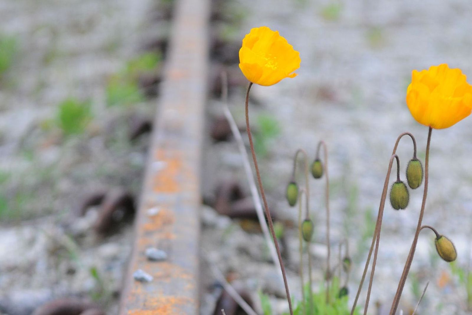 Valmuen blomster i et lite brukt spor på Bjorli stasjon på Raumabanen. Foto: Arvid Bårdstu, Bane NOR