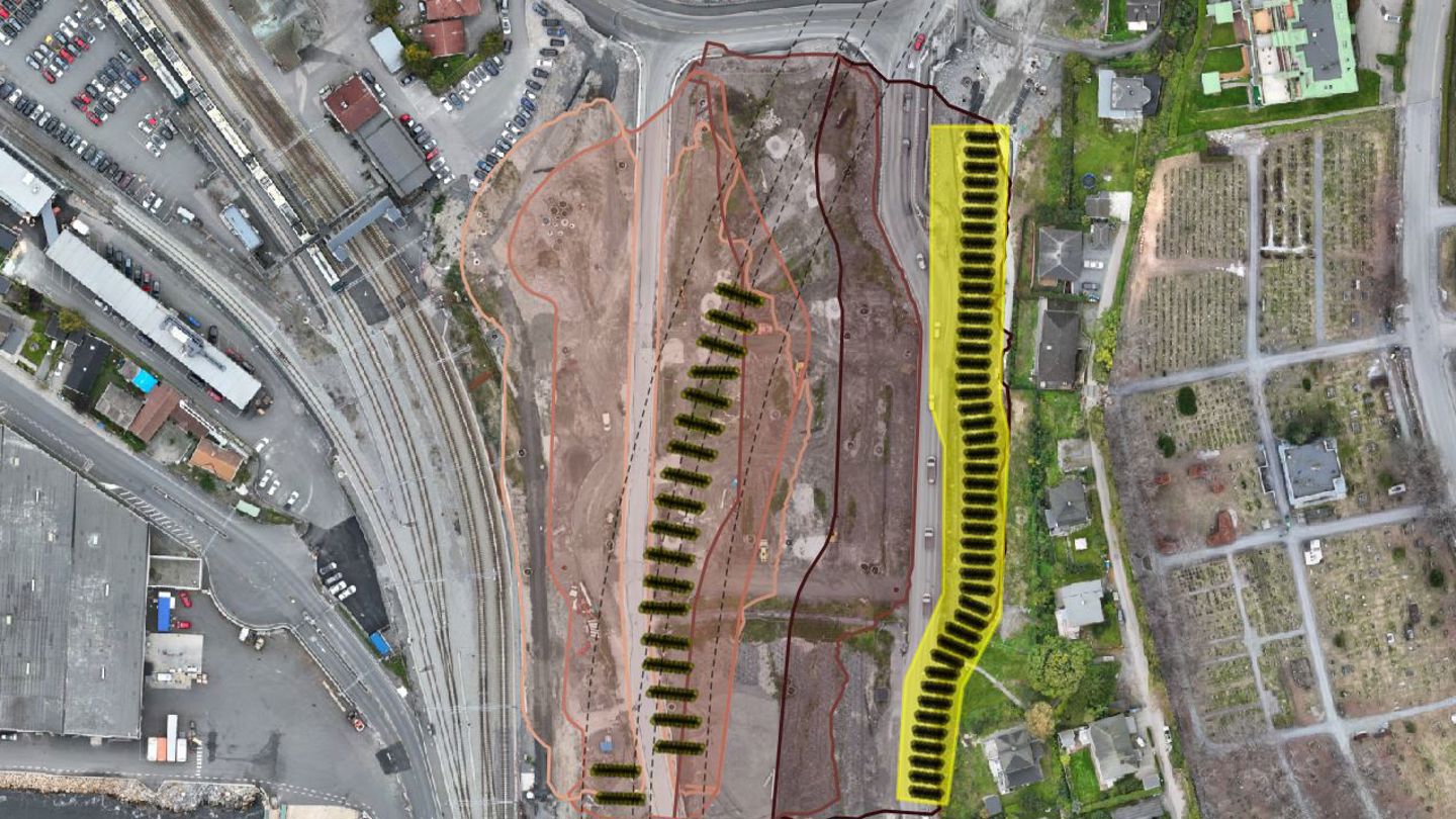 Krevende grunnforhold gjør at områdetstabiliteten må forbedres før vi kan bygge jernbane i sentrum.