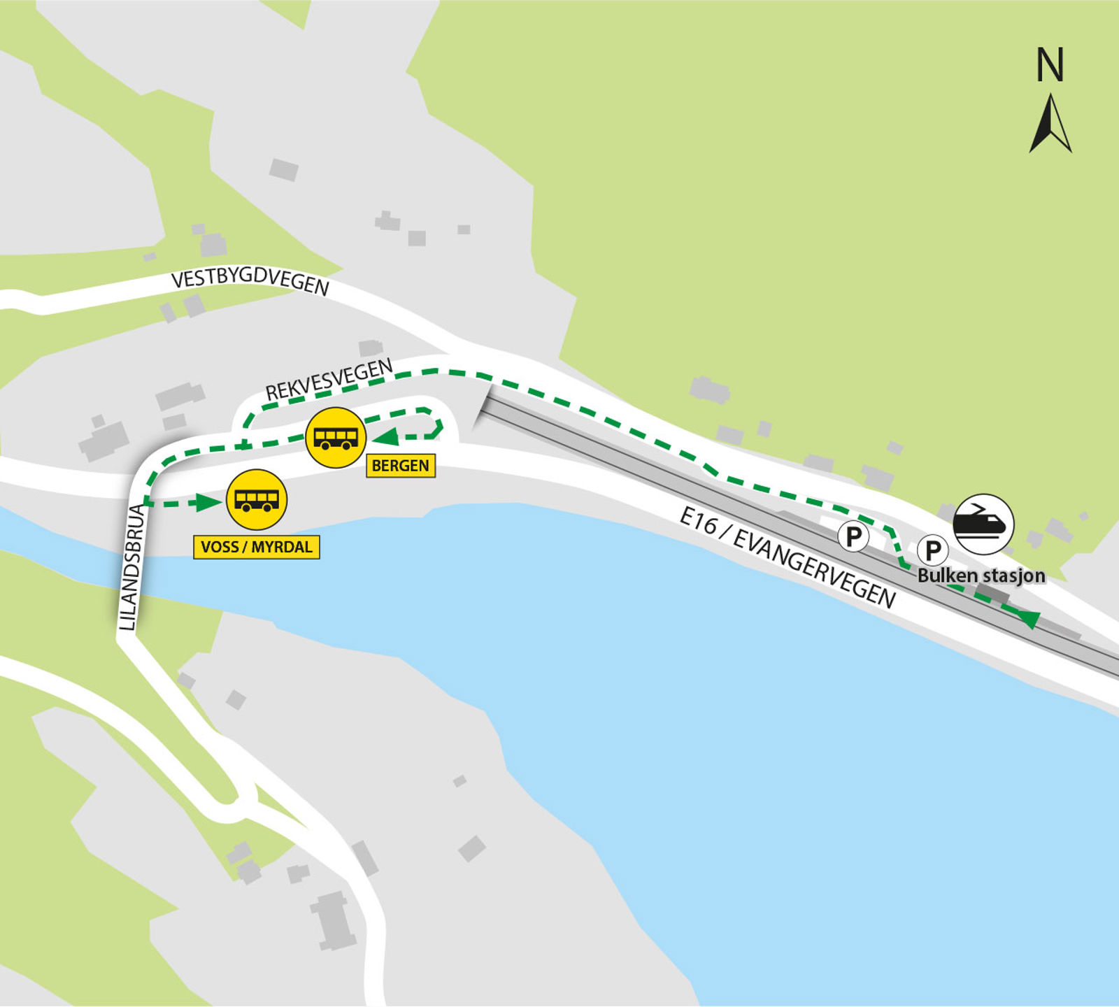 Bussene kjører fra holdeplassene Bulken E16. Gangavstand er ca. 150 meter.