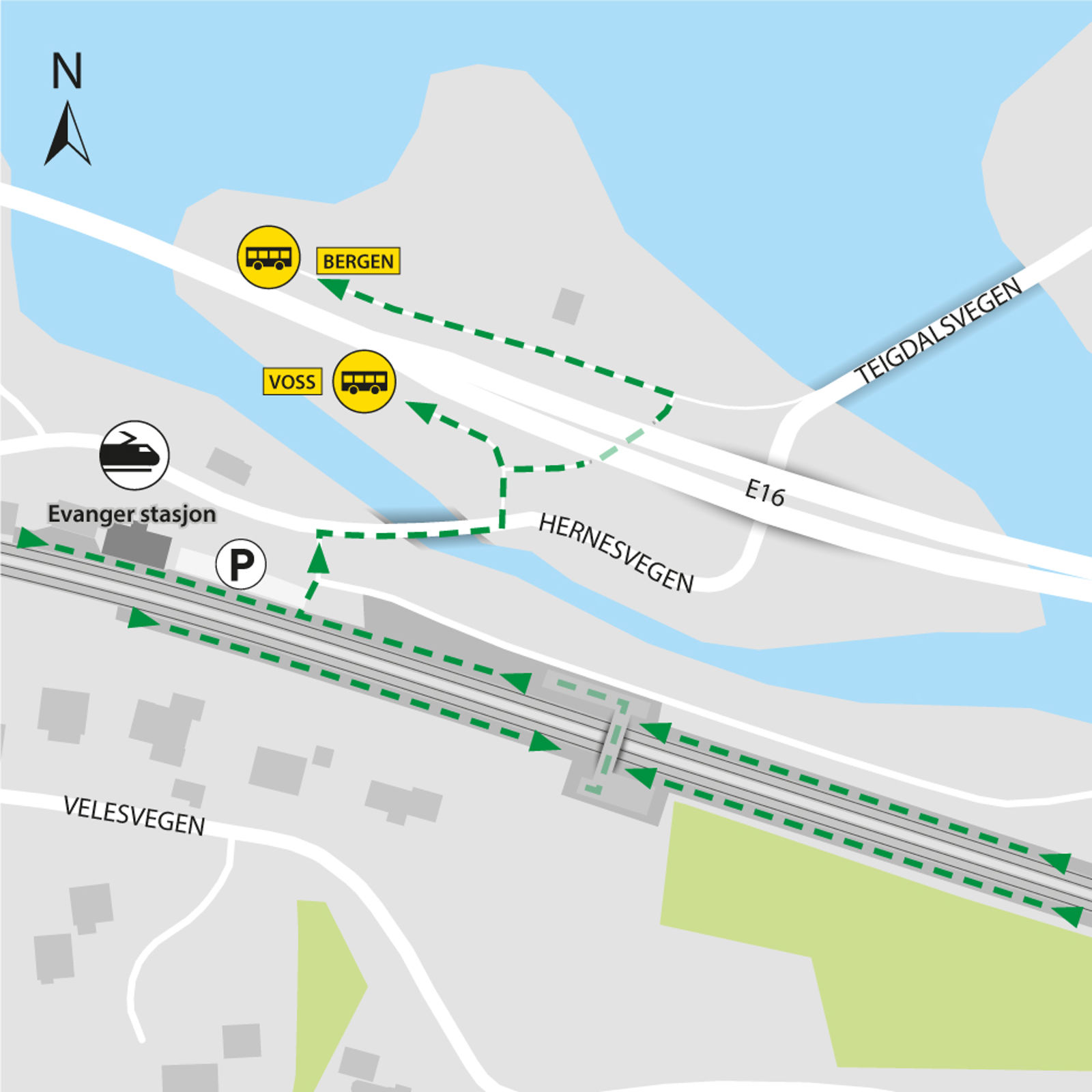 Evanger stasjon i Voss herad ligger på Bergensbanen og Vossebanen. Herfra kan du ta toget i retning Bergen, Voss og Myrdal.