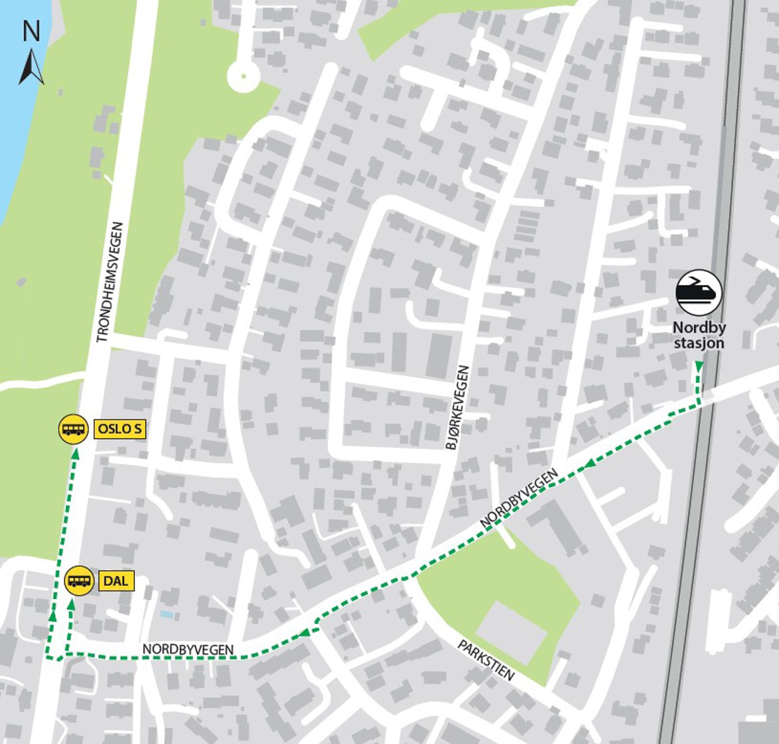 Nordby holdeplass i Ullensaker ligger på Hovedbanen. Herfra kan du ta toget mot Drammen, Oslo S og Dal.