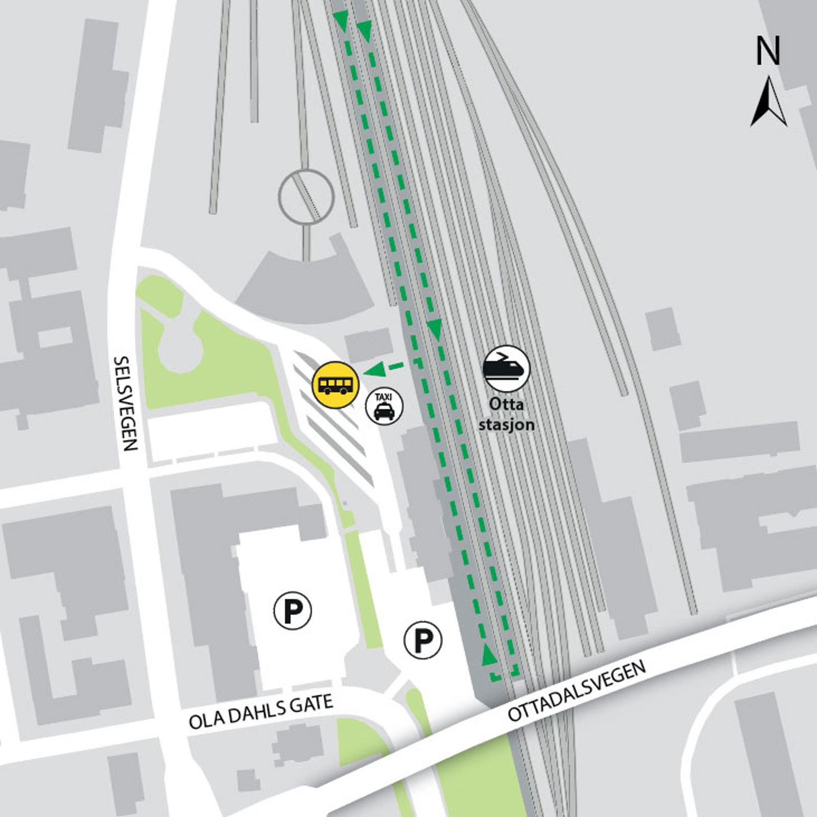 Otta stasjon ligger på Dovrebanen. Herfra kan du ta toget i retning Trondheim, Åndalsnes og Oslo S.
