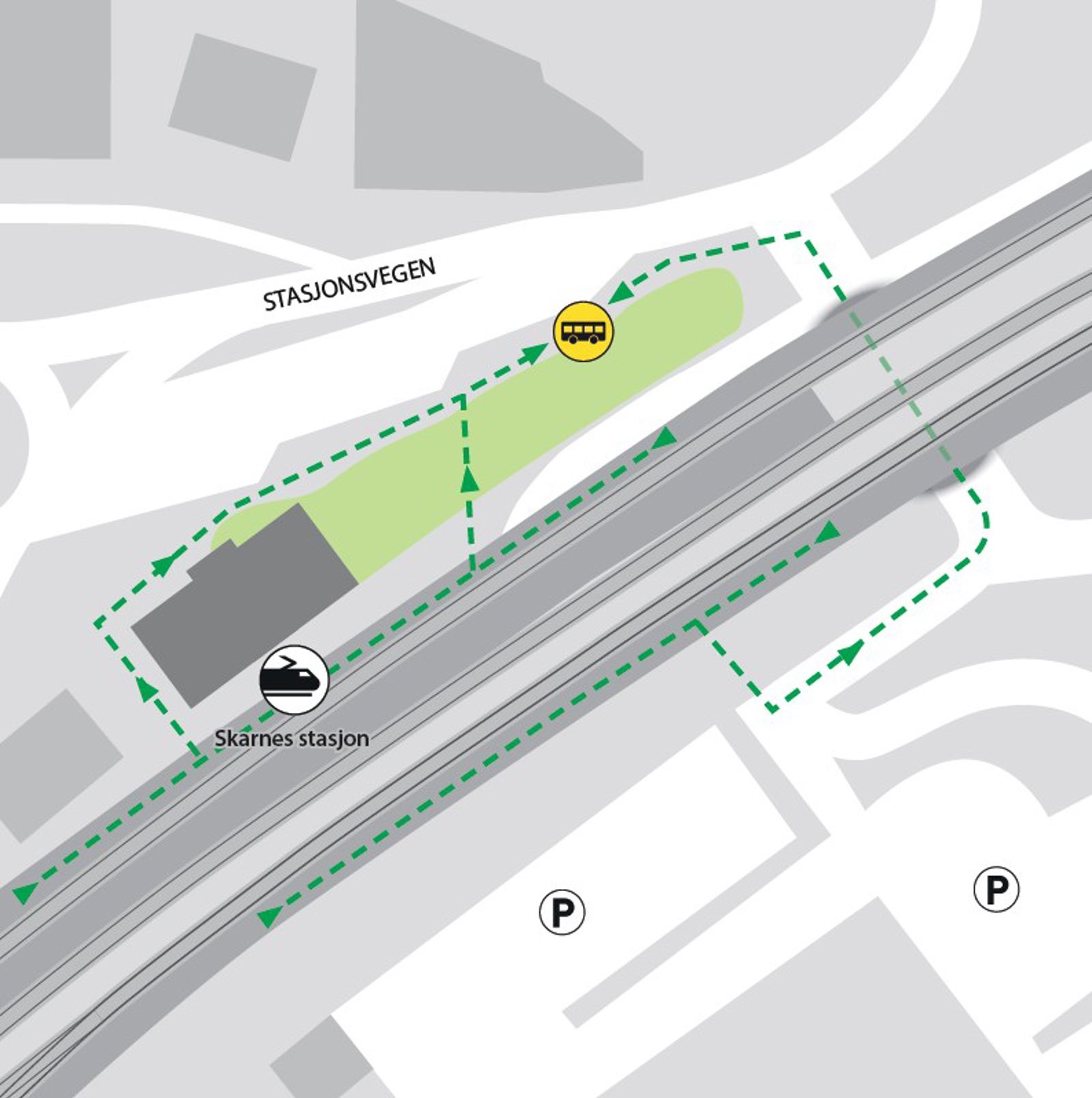 Bussene kjører fra bussholdeplassen Skarnes stasjon. Gangavstand til holdeplassen er ca. 20 og 80 meter.